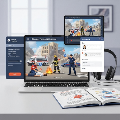 地震・風水害など自然災害発生時にサービスを継続するための計画。被害想定、役割分担、復旧手順、関係機関との連携、最低限の運営体制などをまとめたものです。